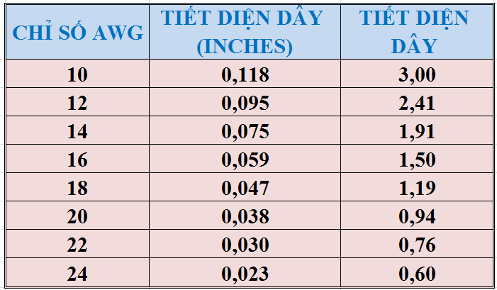 Tiết diện dây được tính theo đơn vị AWG, theo tiêu chuẩn của Mỹ. Dây có chỉ số càng nhỏ thì tiết diện dây càng lớn. Thường thì trong thiết kế âm thanh trong các nhà xưởng, nhà máy, trường học bệnh viện… ta dùng các kích thước dây từ awg22 đến awg 14.